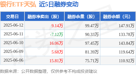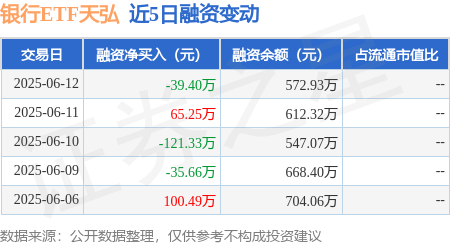 本站消息,6月12日,银行ETF天弘(515290)融资买入91.04万元,融资偿还130.44万元,融资净卖出39.4万元,融资余额572.93万元。